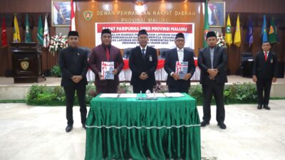 Penyerahan dilakukan oleh Kepala Perwakilan BPK Provinsi Maluku Hery Purwanto, dalam rapat paripurna DPRD Maluku yang dihadiri langsung oleh Ketua DPRD Provinsi Maluku dan pimojan DPRD, Ismail Usemahu selaku Plg Asisten Administrasi Umum Setda Maluku mewakili Penjabat Gubernur Maluku Sadali Ie, Senin (6/5/2024).