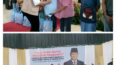 Ambon, Salawaku– 98 Resolution Network Nasional membagikan 2000 paket sembako bantuan Presiden RI Prabowo Subianto, Sabtu (20/12/2025).