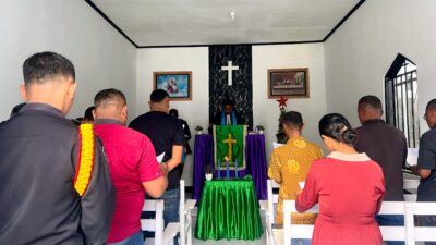 Wahai, Salawaku – Sejumlah Warga Binaan Pemasyarakatan Lembaga Pemasyarakatan (Lapas) Kelas III Wahai beragama Kristen mengikuti ibadah Minggu Adven Pertama dengan penuh khidmat di Gereja Ebenhaezer Lapas, Minggu (30/11). Kegiatan kerohanian ini merupakan bagian dari program pembinaan kepribadian untuk memperkuat iman dan spiritualitas para Warga Binaan dalam menyambut Hari Raya Natal.