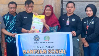 Wahai, Salawaku – Lembaga Pemasyarakatan (Lapas) Kelas III Wahai kembali bagikan bantuan sosial (bansos) sebagai implementasi Program Akselerasi Menteri Imigrasi dan Pemasyarakatan sekaligus motto ‘Pemasyarakatan Pasti Bermanfaat untuk Masyarakat’, Jumat (3/10/2025).