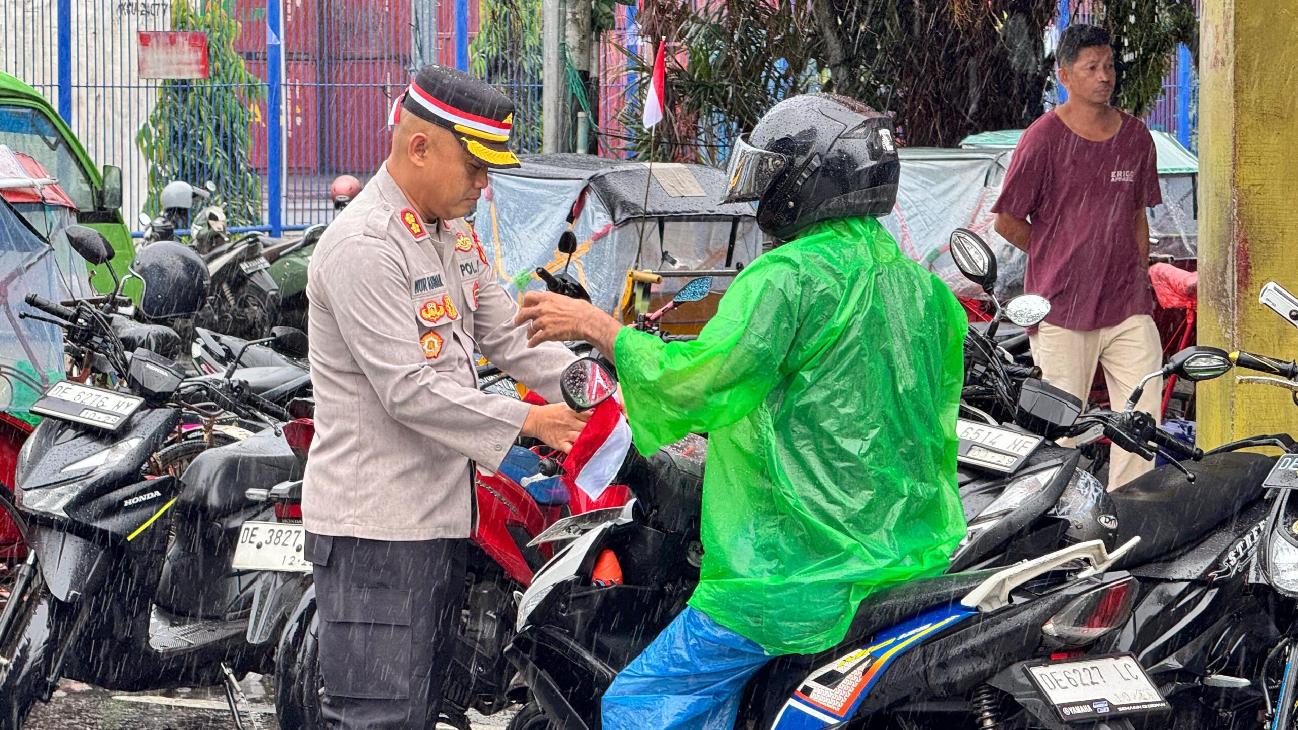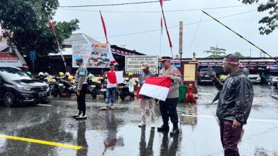 Polresta Ambon Bagikan 200 Bendera Merah Putih di Tengah Hujan Sambut HUT ke-80 RI