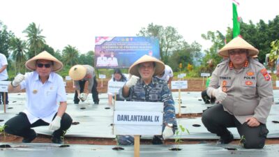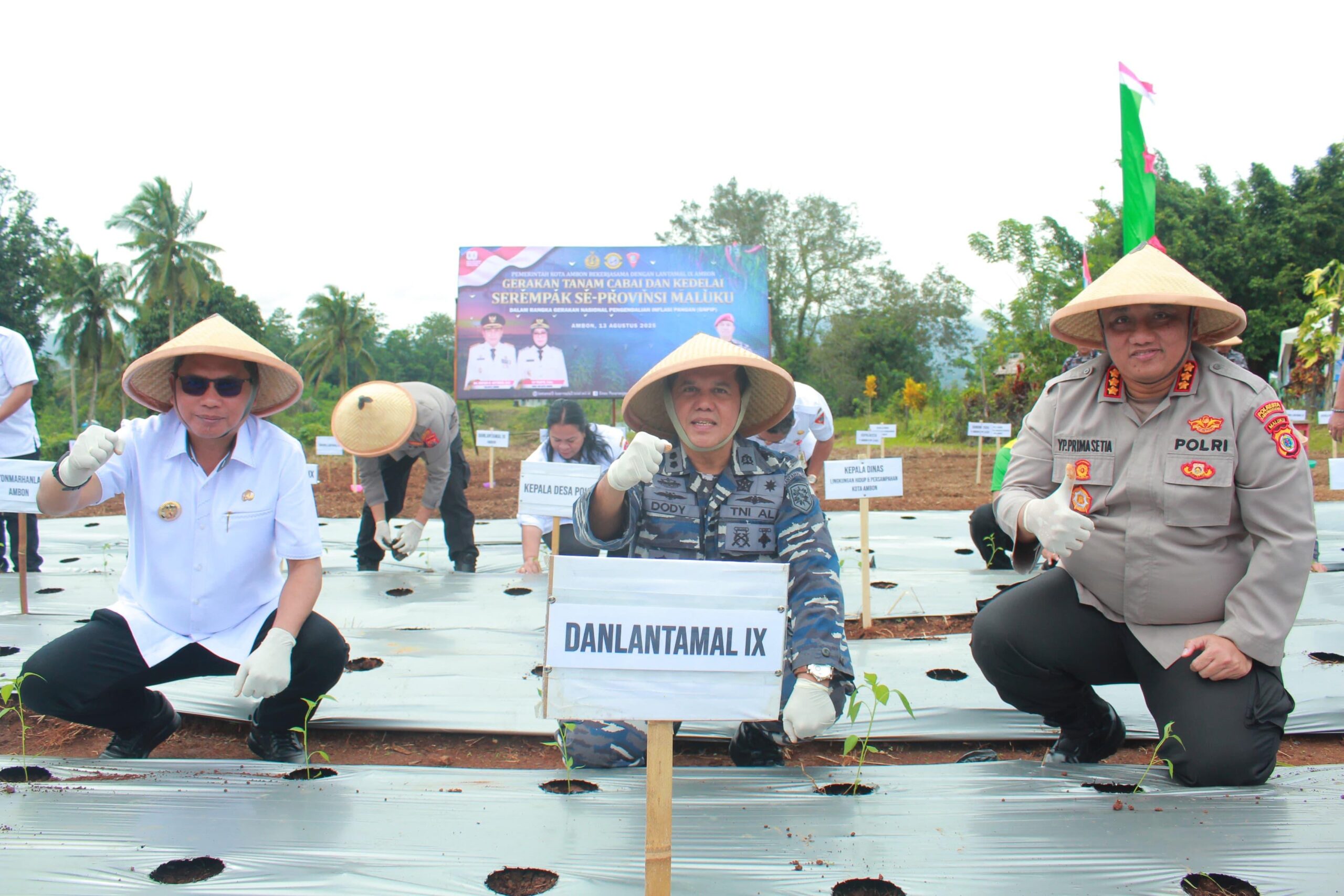 Ambon, Salawaku– Rabu (13/8/2025) pukul 09.30 WIT, jajaran Kepolisian Resor Kota (Polresta) Pulau Ambon dan Pulau-Pulau Lease turut hadir dan mendukung kegiatan Gerakan Tanam Cabai dan Kedelai Serentak se-Provinsi Maluku yang berlangsung di lahan Lantamal IX Ambon, Dusun Karang Karang, Desa Poka, Kecamatan Teluk Ambon. Kegiatan ini menjadi bagian dari Gerakan Nasional Pengendalian Inflasi Pangan (GNPIP) 2025, yang diikuti pemerintah daerah, unsur TNI-Polri, dan masyarakat.