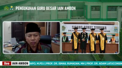 Salawaku, Sekretaris Jenderal (Sekjen) Kementerian Agama RI, Prof. Dr. Nizar Ali, M.Ag mengukuhkan tiga Guru Besar Institut Agama Islam Negeri (IAIN) Ambon secara virtual zoom, yang terpusat di Gedung Auditorium IAIN Ambon, Rabu, 28 Februari 2024.