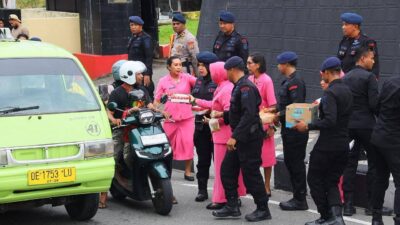 Ambon, Salawaku – Semangat berbagi di bulan suci Ramadan kembali ditunjukkan oleh personel Satuan Brimob Polda Maluku bersama Bhayangkari dengan membagikan takjil kepada masyarakat yang melintas di depan Markas Komando (Mako) Satbrimob Polda Maluku, Jalan Jenderal Sudirman, Tantui, Kota Ambon, Sabtu (7/3/2026).