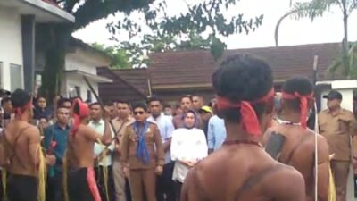 Kedatangan rombongan PJ Gubernur juga disambut tarian adat dan pengalungan kain adat sebagai tanda ungkapan selamat datang serta diiringi paduan terompet dan hadrat.