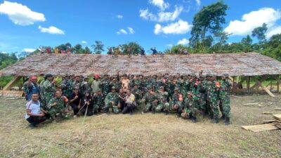 Ambon, Salawaku– Personil TNI dan Polri dibantu masyarakat Negeri Roho, Kecamatan Seram Utara Kabupaten Maluku Tengah (Malteng) bergotong royong membangun kembali SMP Negeri 113 Maluku Tengah yang ambruk.