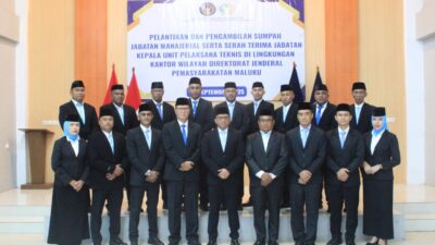 Ambon, Salawaku – Kepala Kantor Wilayah (Kakanwil) Direktorat Jenderal Pemasyarakatan (Ditjenpas) Maluku, Ricky Dwi Biantoro, melantik 18 pejabat manajerial di lingkungan Kanwil Ditjenpas Maluku, Selasa(30/9). Kegiatan yang berlangsung di Kanwil Ditjenpas Maluku ini juga dirangkaikan dengan serah terima jabatan (sertijab) sejumlah Kepala Unit Pelaksana Teknis (Ka. UPT) Pemasyarakatan.