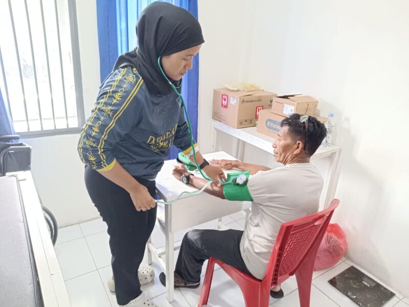 Pemeriksaan cek kesehatan gratis ini meliputi anamnese riwayat kesehatan dan pemeriksaan tekanan darah, pengukuran heart rate dan saturasi oksigen yang dilakukan oleh petugas kesehatan Lapas Wahai, Fitri Rianti, yang juga memberikan edukasi kesehatan tentang pola hidup sehat pentingnya menjaga makanan yang sehat.